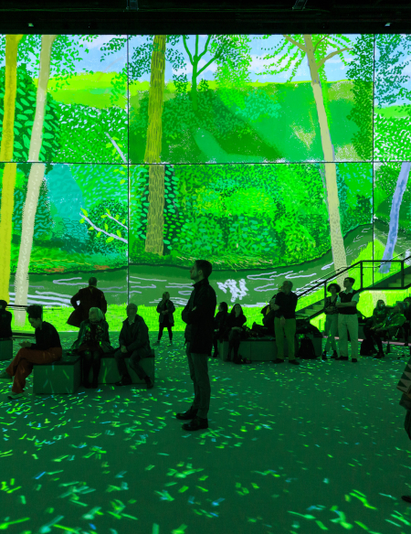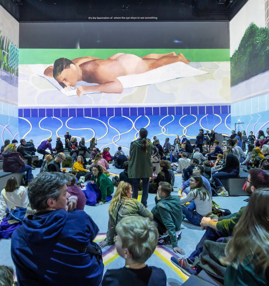 입체적 공간에 다채로운 음악과 조명 연출, 그리고 무빙 이미지가 더해져 기존 미술관이나 갤러리 전시에서는 만나기 어려운 감각적 경험을 선사합니다. 특히 전시장에 가득찬 커다란 화면을 통해 데이비드 호크니가 아이패드로 그림을 그리는 과정을 지켜보며, 관객은 거장의 바로 뒤에서 작품의 탄생을 함께하는 경험을 하게 됩니다.