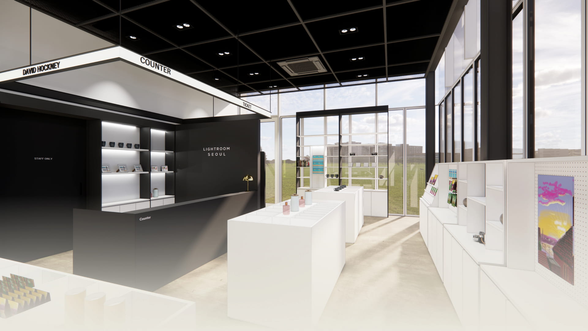 라이트룸 전시장에서 나와 산책하듯 정원을 가로질러 가면 숲 속의 상점 같은 ‘라이트룸 숍’을 만날 수 있습니다.라이트룸 숍은 전시 프로그램북을 비롯한 아트 상품, 작가에 관한 전문 서적 등을 탐독하며 전시 관람 경험을 확장할 수 있는 곳입니다. 토트백, 티셔츠, 포스터, 스케치북 등 영국 라이트룸의 제작 상품을 독점 판매하는 것은 물론 전시와 관련된 전 세계 각지의 상품을 진열했습니다. 또한 포토부스가 있어 전시에 대한 특별한 경험과 기억을 간직할 수 있습니다. 현장 전시 티켓 역시 라이트룸 숍에서 구매 가능해 라이트룸 여정의 시작과 마무리를 함께할 수 있는 공간입니다.